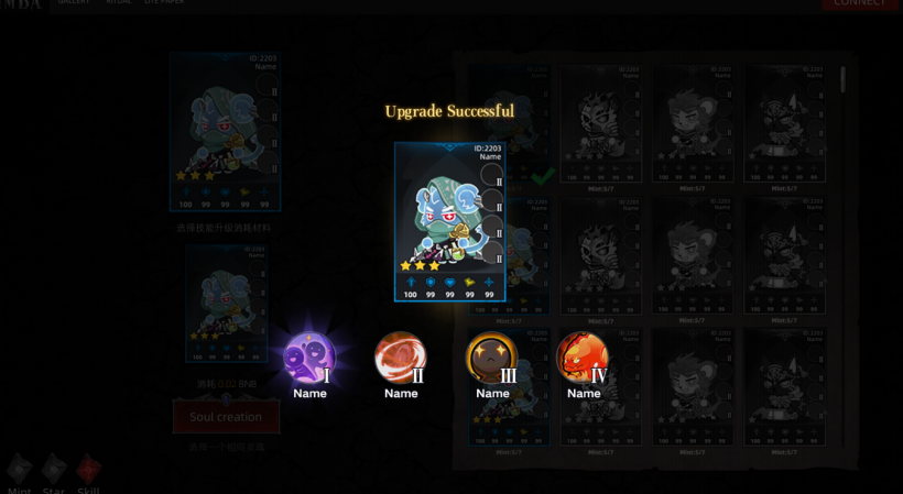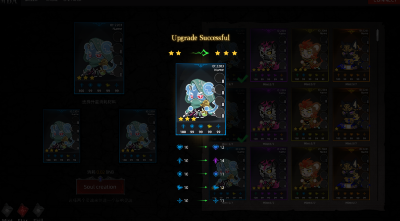 Atman Star Ascension involves consuming other Atman to advance. Star ascension enhances a Atman's qualification attributes, and the Atman's star rating is stored as a property on the blockchain.